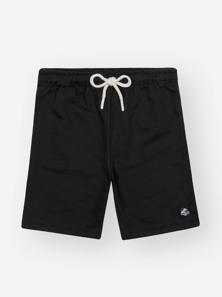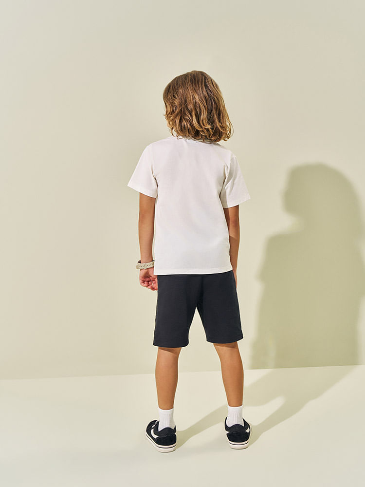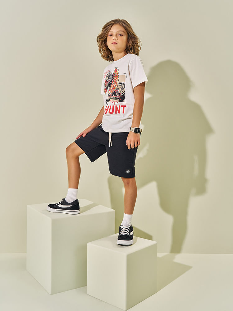 A bermuda é confeccionada em moletom 100% algodão, com elástico e cadarço na cintura, garantindo ajuste perfeito e conforto total. O look é finalizado com uma etiqueta decorativa próxima à barra, trazendo um toque moderno e exclusivo ao visual.