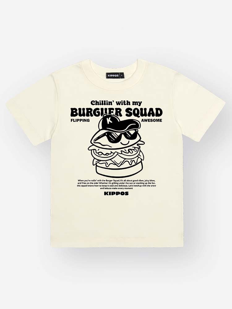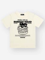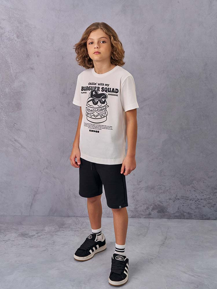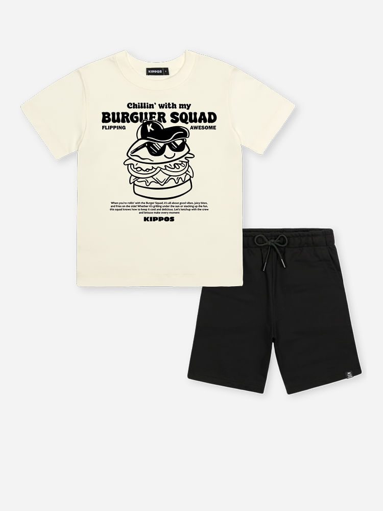 A estampa divertida da camiseta traz um hambúrguer estilizado com lettering moderno, que deixa o look descontraído e cheio de personalidade. A bermuda preta complementa com um design versátil e fácil de combinar.