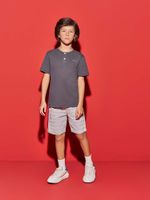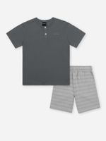 O design moderno traz camiseta com peitilho e botões funcionais, além da logo bordada discreta que valoriza o visual clássico. Já a bermuda possui padronagem em listras sutis e cós com elástico, proporcionando ajuste perfeito e praticidade.