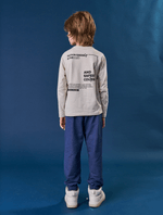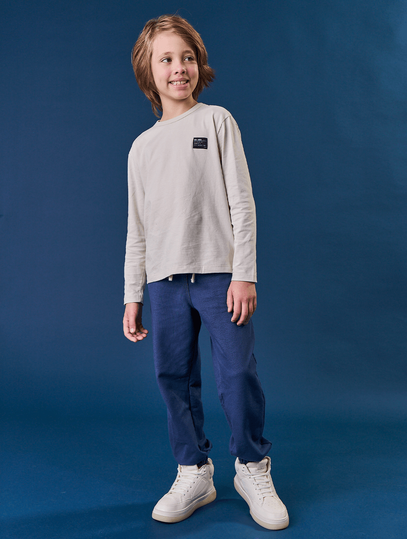 Conjunto masculino de camiseta em meia malha com etiqueta decorativa no peito e calça jogger em molecotton jeans com elástico e cadarço decorativo no cós bolsos frontais e elástico nos punhos. Inverno 2024. Modelo veste tamanho 8 e possui 1 34 cm de altura.