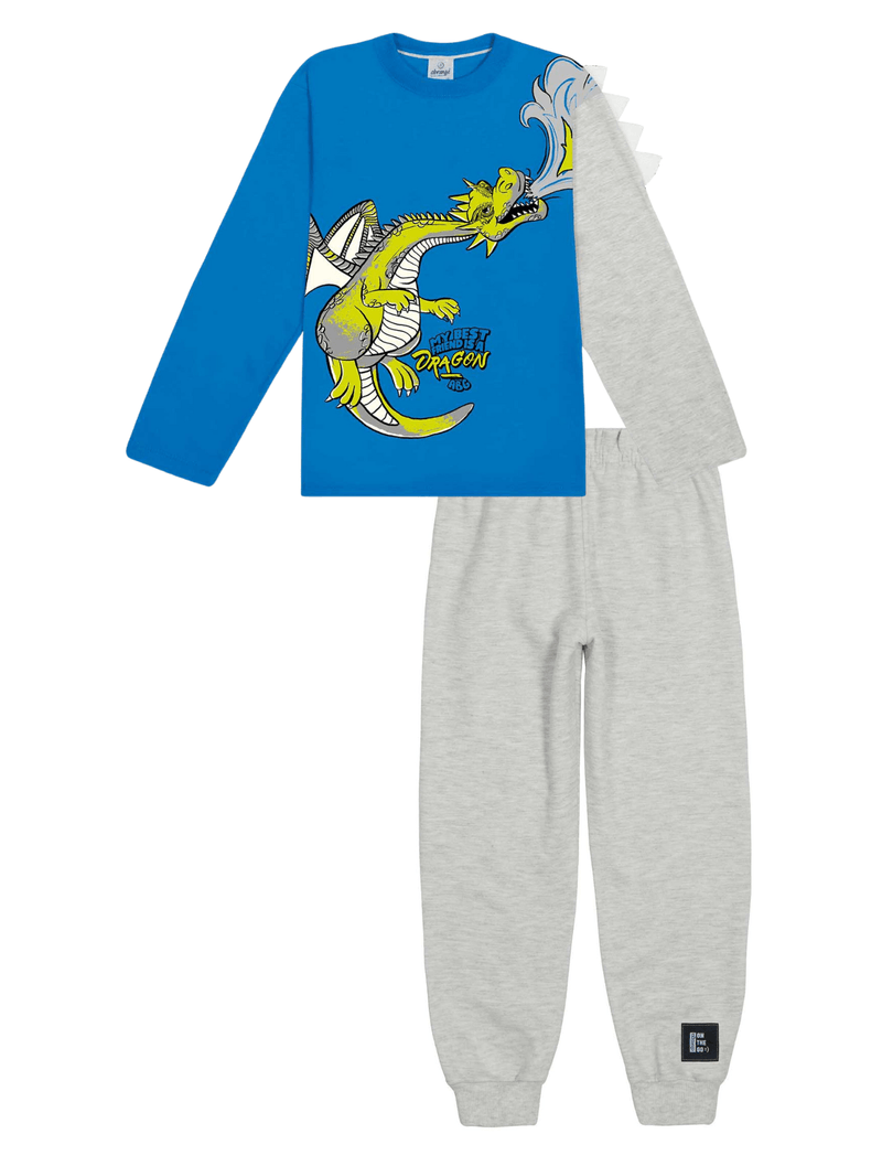 Conjunto de camiseta em meia malha com estampa frontal de dragão, manga contrastante e detalhe interativo na manga, calça em moletom com etiqueta decorativa próximo do punho. Coleção Inverno 2023. Modelo veste tamanho 6. Tradução da estampa: Meu melhor amigo é um dragão.