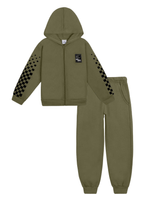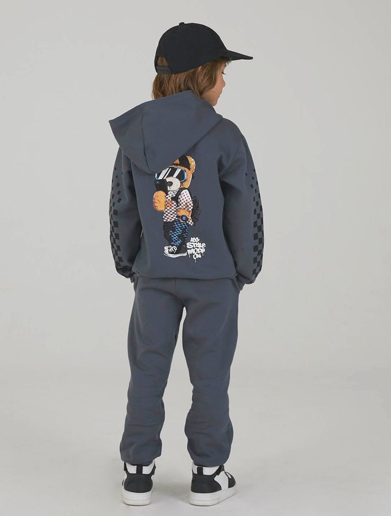 Conjunto de jaqueta em moletom felpado com capuz e zíper, estampa super estilosa nas mangas e nas costas e calça em moletom felpado com bolsos. Coleção Inverno 2023. Modelo veste tamanho 6. Tradução da estampa: Quer dirigir?
