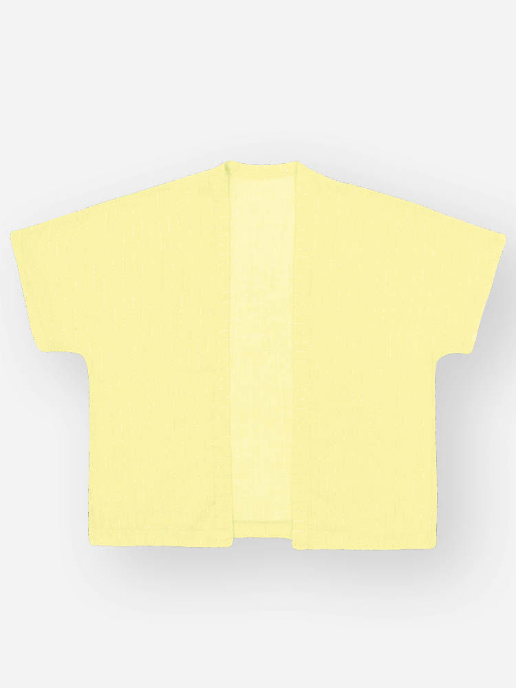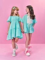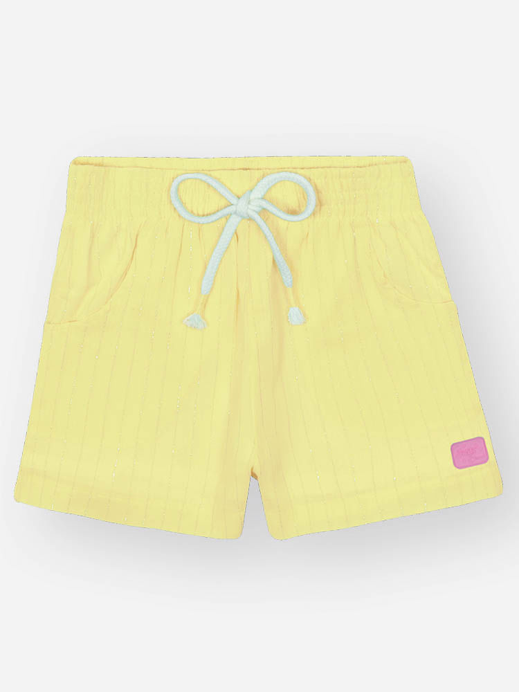 Acompanha kimono leve e sofisticado em tecido listrado com fios de lurex, perfeito para dar um toque fashion aos dias mais quentes. O short coordenado, também em tecido listrado com brilho sutil, conta com elástico nas costas para maior conforto da menina, além de cadarço decorativo na cintura, bolsos funcionais e etiqueta especial próxima à barra.