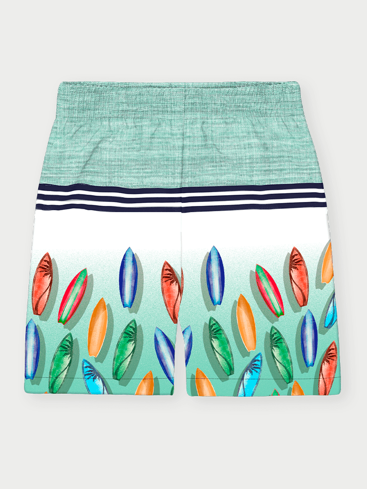 Já a bermuda é feita em tactel surf, um tecido leve, com toque liso e suave, perfeito para garantir liberdade de movimentos e sensação de frescor. Além disso, o tactel possui secagem rápida, ideal para dias de passeio ao ar livre ou momentos à beira da água. A estampa de pranchas de surf em sublimação reforça o clima descontraído e litorâneo do conjunto, enquanto o elástico na cintura garante um ajuste confortável e prático.