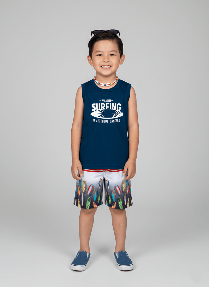 O conjunto para menino, disponível nos tamanhos 01 ao 08, é a escolha perfeita para os dias quentes e cheios de brincadeira. Composto por regata e bermuda, o look combina conforto, estilo e uma vibe bem praiana. Disponível nas cores branco, verde e azul marinho.