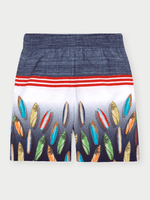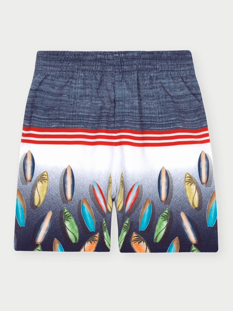 Já a bermuda é feita em tactel surf, um tecido leve, com toque liso e suave, perfeito para garantir liberdade de movimentos e sensação de frescor. Além disso, o tactel possui secagem rápida, ideal para dias de passeio ao ar livre ou momentos à beira da água. A estampa de pranchas de surf em sublimação reforça o clima descontraído e litorâneo do conjunto, enquanto o elástico na cintura garante um ajuste confortável e prático.
