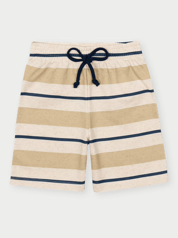 A bermuda em moletom linho tem um toque levemente texturizado, com aparência natural e confortável. É um tecido encorpado na medida certa, fresco e agradável ao toque, que confere um visual mais sofisticado sem perder o conforto. O elástico na cintura garante um ajuste confortável, e o cadarço decorativo complementa o estilo. A estampa listrada em sublimação traz um toque visual descolado e moderno, ideal para looks casuais cheios de personalidade.