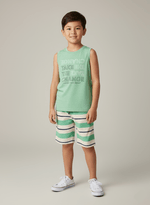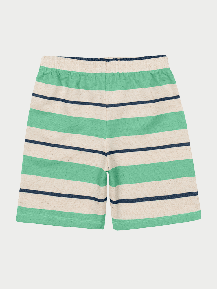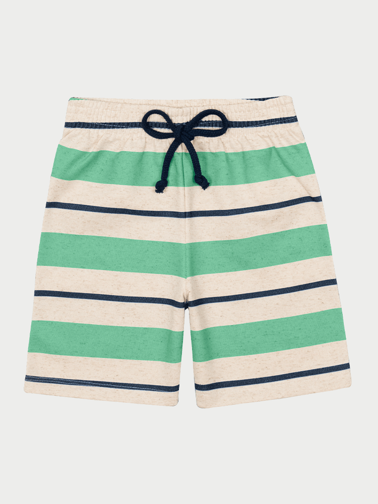 A bermuda em moletom linho tem um toque levemente texturizado, com aparência natural e confortável. É um tecido encorpado na medida certa, fresco e agradável ao toque, que confere um visual mais sofisticado sem perder o conforto. O elástico na cintura garante um ajuste confortável, e o cadarço decorativo complementa o estilo. A estampa listrada em sublimação traz um toque visual descolado e moderno, ideal para looks casuais cheios de personalidade.
