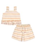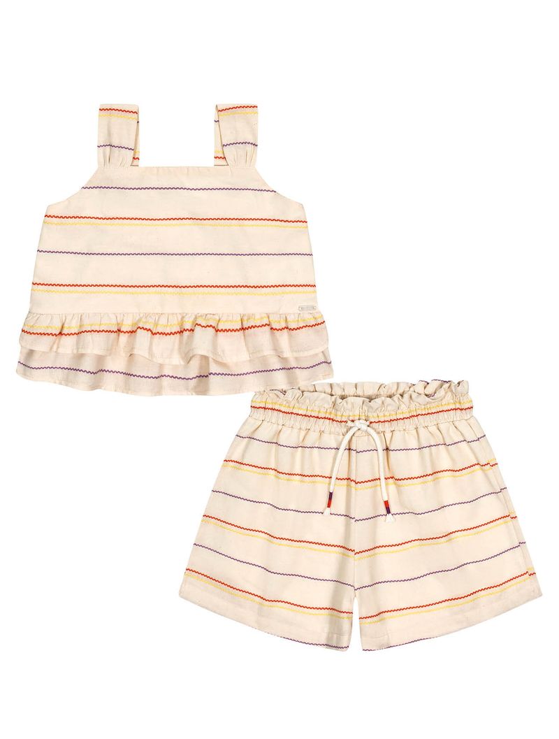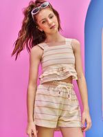 Conjunto versátil e moderno é perfeito para quem busca estilo e conforto. A regata cropped apresenta um detalhe sofisticado com leve franzido na alça e recorte com babados, além de uma plaquinha decorativa que adiciona um toque de elegância. O elástico nas costas garante um ajuste perfeito, enquanto o short em tecido Malibu exibe um cós estilo clochard, complementado por elástico e cadarço para um visual moderno e despojado. Ideal para diversas ocasiões, este conjunto é uma escolha perfeita para quem valoriza praticidade e versatilidade. Primavera 24. A modelo veste tamanho 14 e possui 1,62 cm de altura.