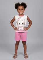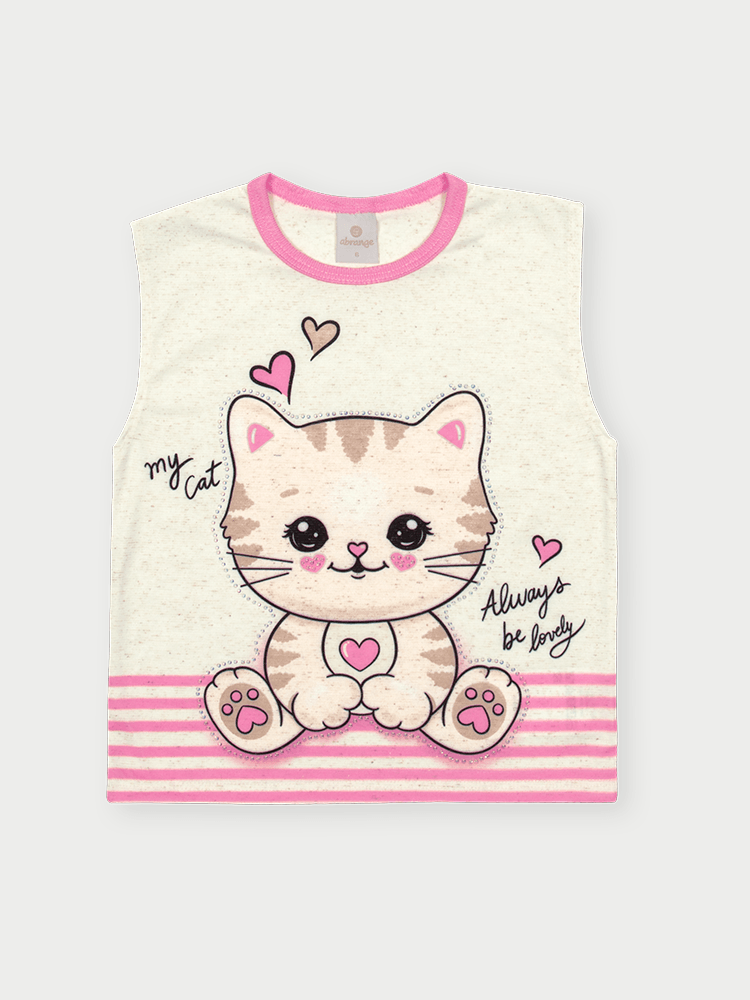 A regata em cotton linho possui toque macio, levemente rústico e fresco ao vestir, graças à mistura do algodão com o linho, que traz uma textura suave e natural. O friso em moletinho atoalhado no decote dá um contraste interessante ao visual, com toque felpudinho e aconchegante, além de deixar o acabamento mais delicado. As cavas com bainha mantêm o conforto, e a estampa de gatinho em sublimação com aplicação de strass traz brilho e charme na medida certa para as pequenas.