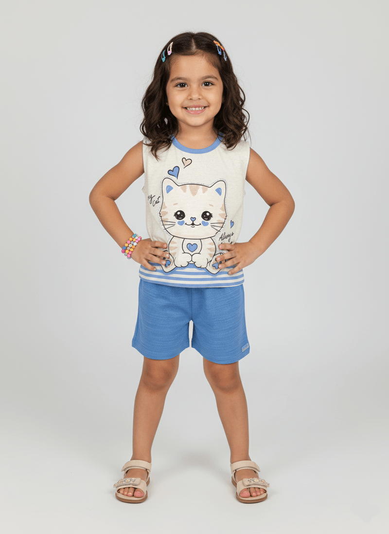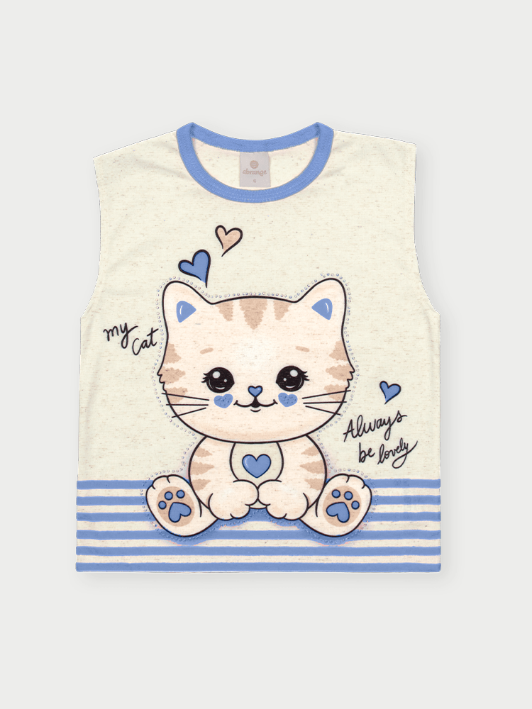 A regata em cotton linho possui toque macio, levemente rústico e fresco ao vestir, graças à mistura do algodão com o linho, que traz uma textura suave e natural. O friso em moletinho atoalhado no decote dá um contraste interessante ao visual, com toque felpudinho e aconchegante, além de deixar o acabamento mais delicado. As cavas com bainha mantêm o conforto, e a estampa de gatinho em sublimação com aplicação de strass traz brilho e charme na medida certa para as pequenas.