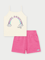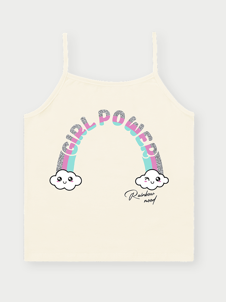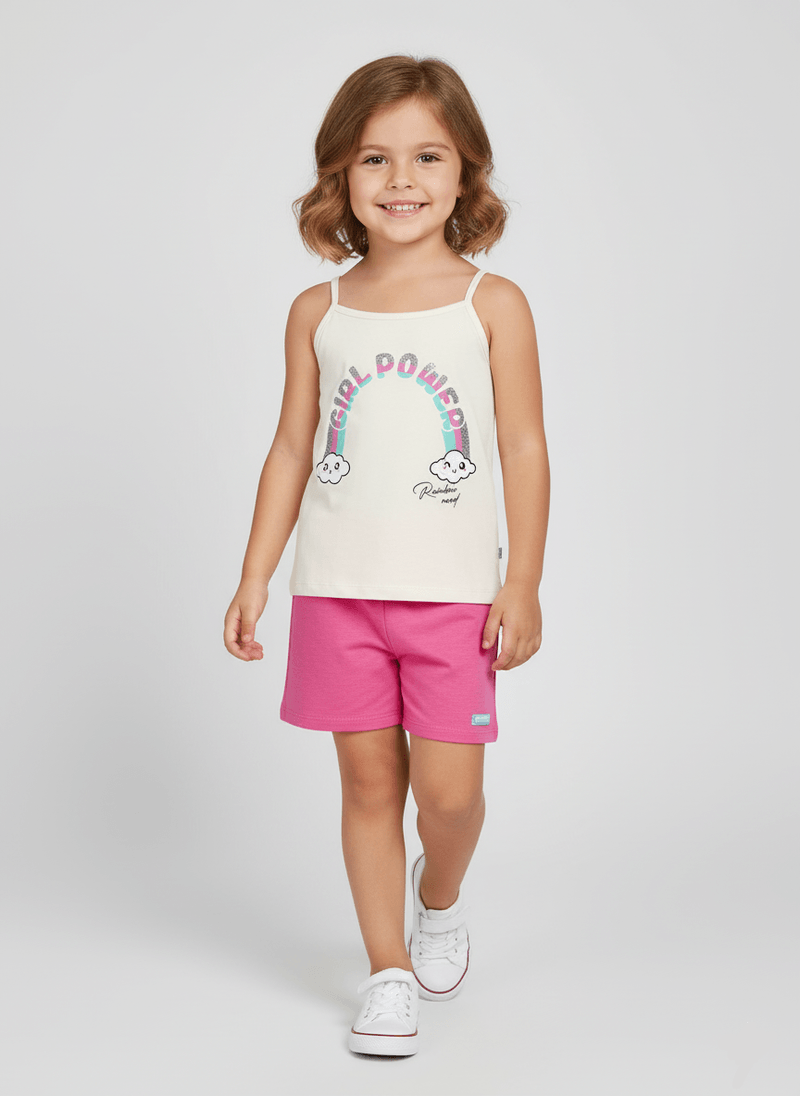 A regata em cotton possui toque extremamente macio, levemente encorpado e com excelente elasticidade, proporcionando ajuste confortável ao corpo sem apertar. O friso em cotton nas alças e cavas complementa com suavidade e acabamento delicado. A estampa de arco-íris com lettering "Girl Power" e aplicação de glitter traz um toque divertido e empoderado, ideal para meninas cheias de atitude.