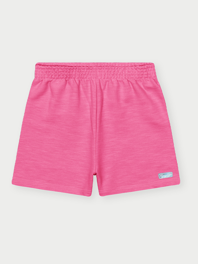 O short em moletom molinê tem toque macio com leve textura mesclada, oferecendo um visual moderno e sensação aconchegante ao vestir. O elástico na cintura permite liberdade de movimento e facilidade na hora de vestir, e a etiqueta decorativa na barra adiciona um charme especial à peça.