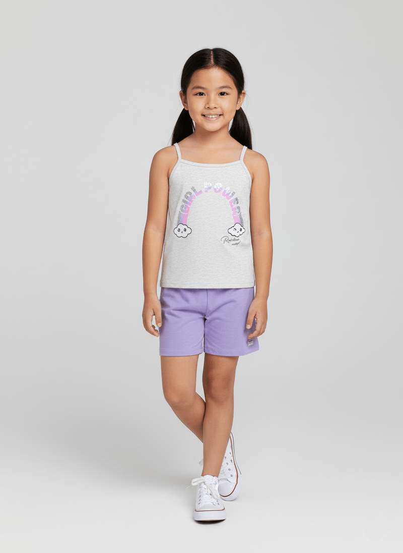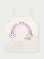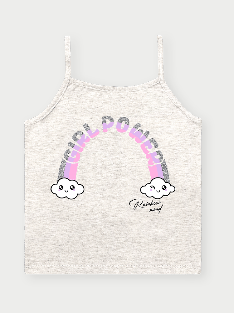 A regata em cotton possui toque extremamente macio, levemente encorpado e com excelente elasticidade, proporcionando ajuste confortável ao corpo sem apertar. O friso em cotton nas alças e cavas complementa com suavidade e acabamento delicado. A estampa de arco-íris com lettering "Girl Power" e aplicação de glitter traz um toque divertido e empoderado, ideal para meninas cheias de atitude.