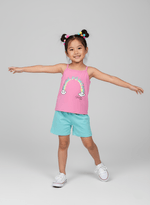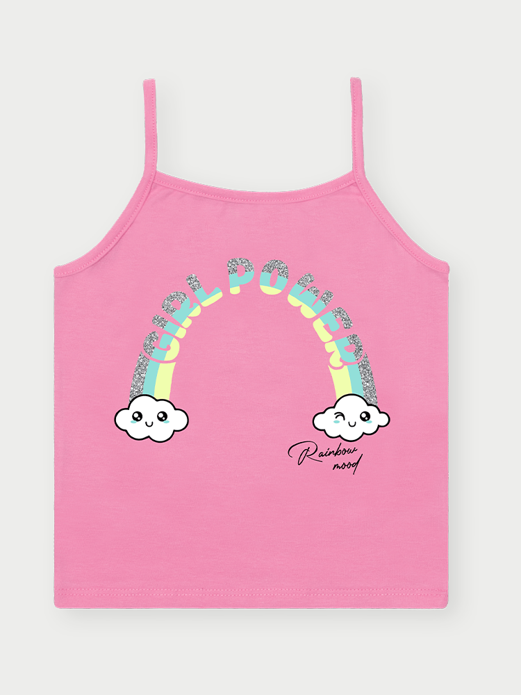 A regata em cotton possui toque extremamente macio, levemente encorpado e com excelente elasticidade, proporcionando ajuste confortável ao corpo sem apertar. O friso em cotton nas alças e cavas complementa com suavidade e acabamento delicado. A estampa de arco-íris com lettering "Girl Power" e aplicação de glitter traz um toque divertido e empoderado, ideal para meninas cheias de atitude.
