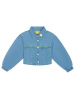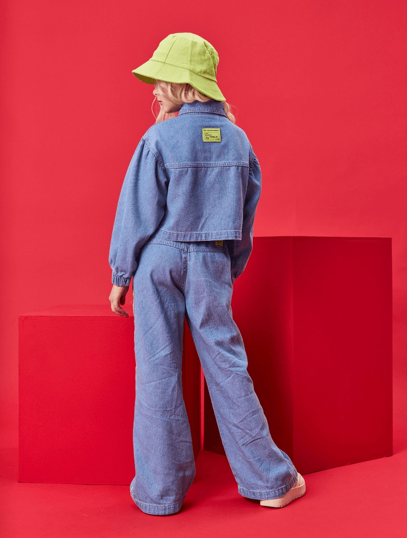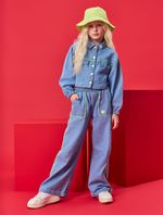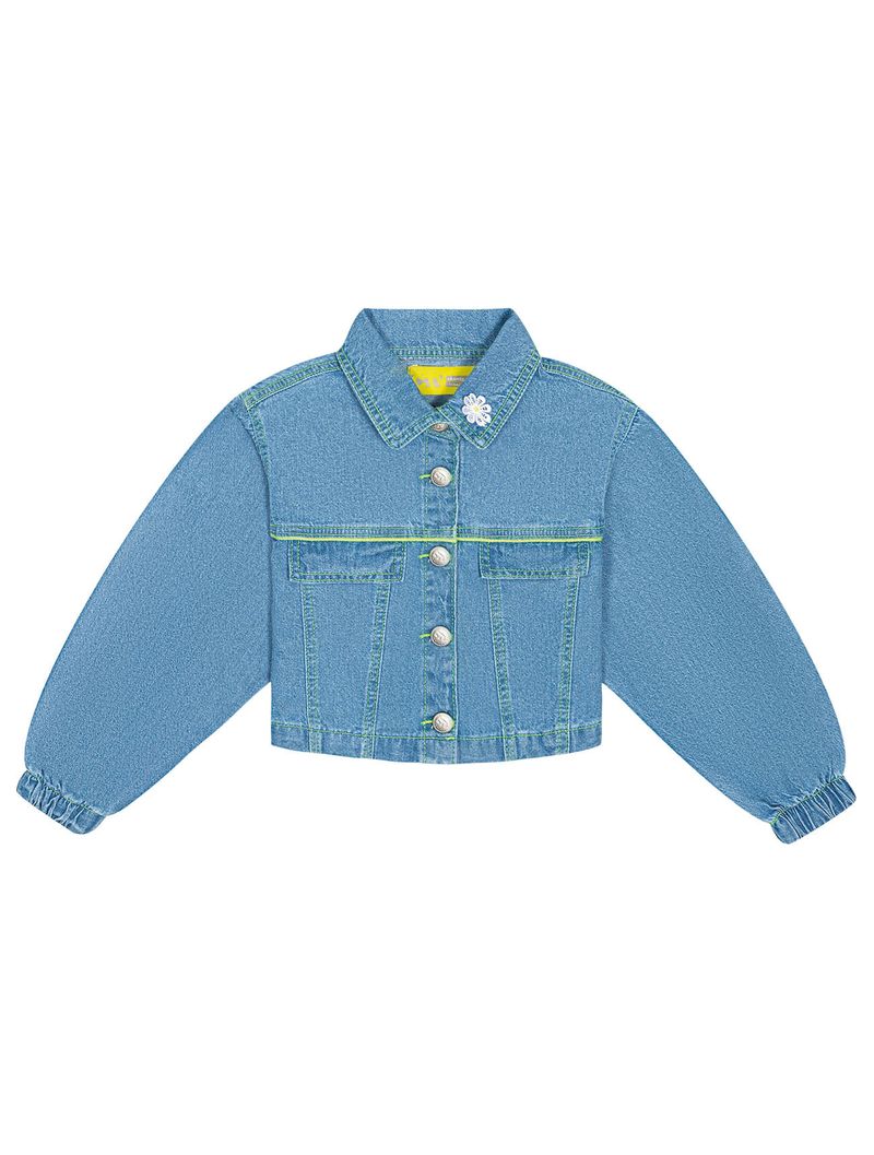 Jaqueta infantil feminina em jeans charm com abertura em botões, detalhe de recortes com lapela decorativa, etiqueta decorativa nas costas, punhos com elástico e costuras constrastantes. Inverno 2024. Modelo veste tamanho 8 e possui 1,31 cm de altura.