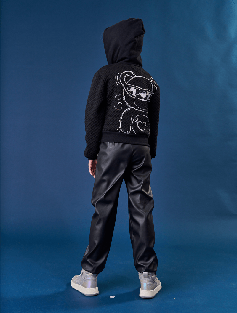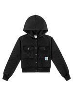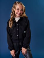 Jaqueta feminina em matelassê com abertura em botões bolsos com lapelas etiqueta decorativa no bolso e estampa super trend nas costas. Inverno 2024. Modelo veste tamanho 8 e possui 1 35 de altura.