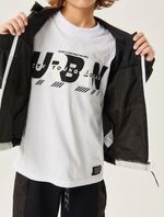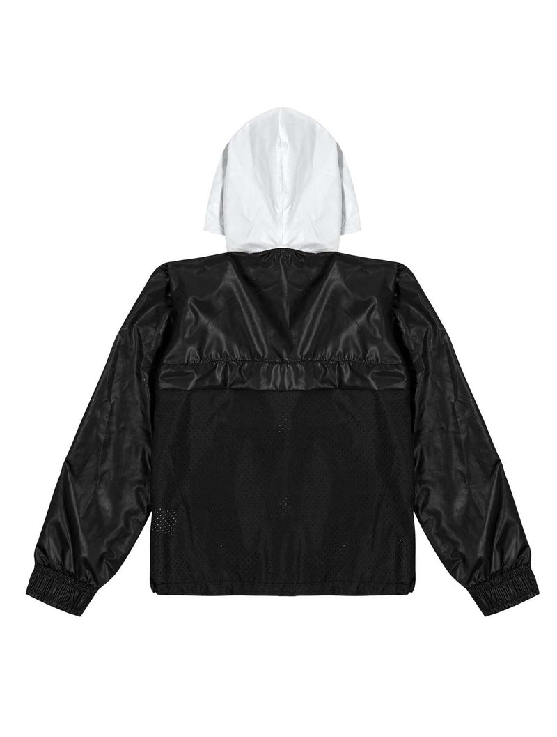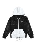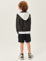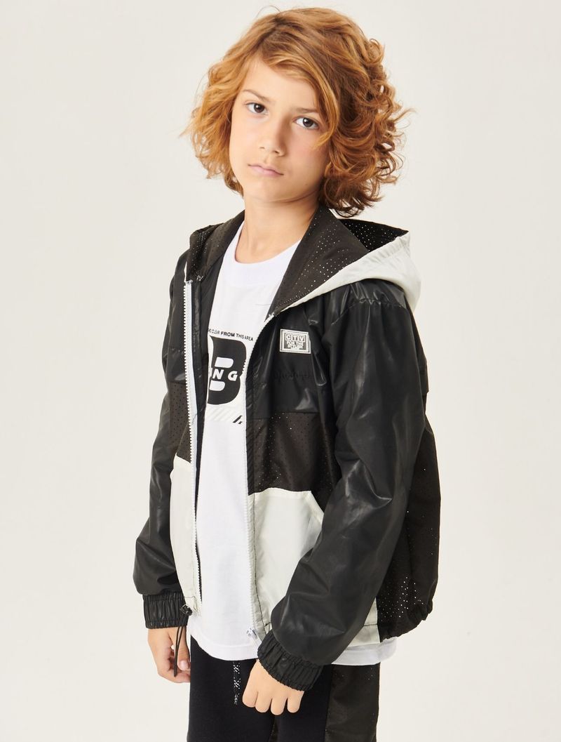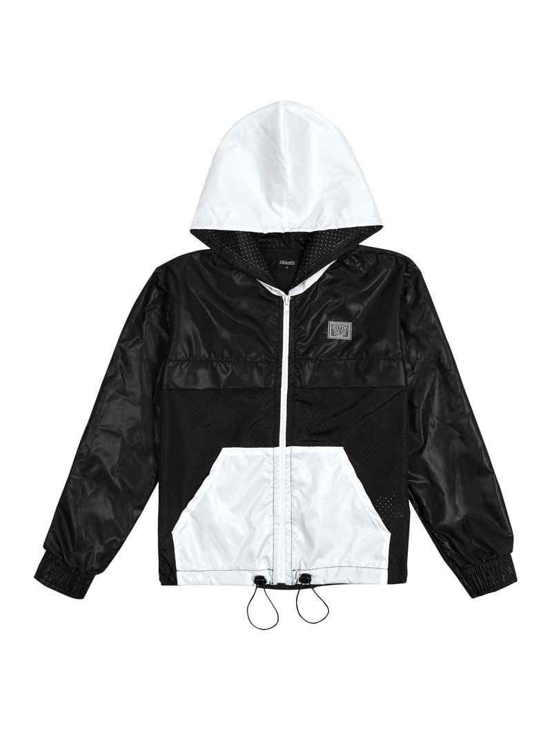 Jaqueta corta vento em nylon com capuz e bolsos contrastantes, etiqueta decorativa no peito, abertura com zíper, elástico na barra com regulador e punhos com elástico. Primavera 2023. Modelo veste tamanho 8 e possui 1,26 de altura.