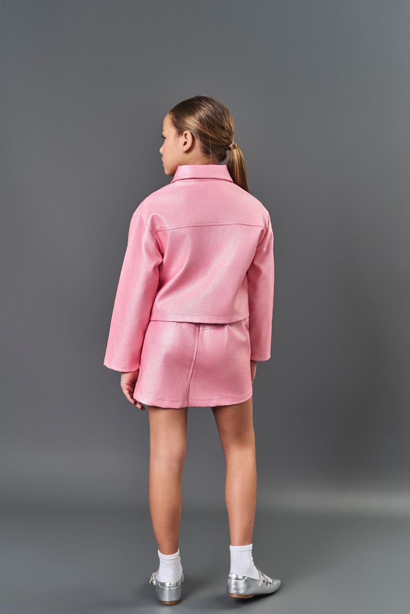 Jaqueta boxy em courino metalizado, uma peça cheia de atitude e brilho para as pequenas. Com lapela decorativa no peito, o modelo traz um toque sofisticado e moderno, ideal para compor looks arrojados. O fechamento em botões oferece praticidade e estilo, enquanto a cava levemente deslocada proporciona um caimento descomplicado e confortável. A etiqueta decorativa próxima à barra adiciona um charme discreto e exclusivo. Perfeita para complementar looks mais urbanos ou sofisticados, esta jaqueta é ideal para momentos especiais ou para arrasar no dia a dia com muito estilo. Inverno 2025. Modelo veste tamanho 8 e possui 1,34cm de altura.
