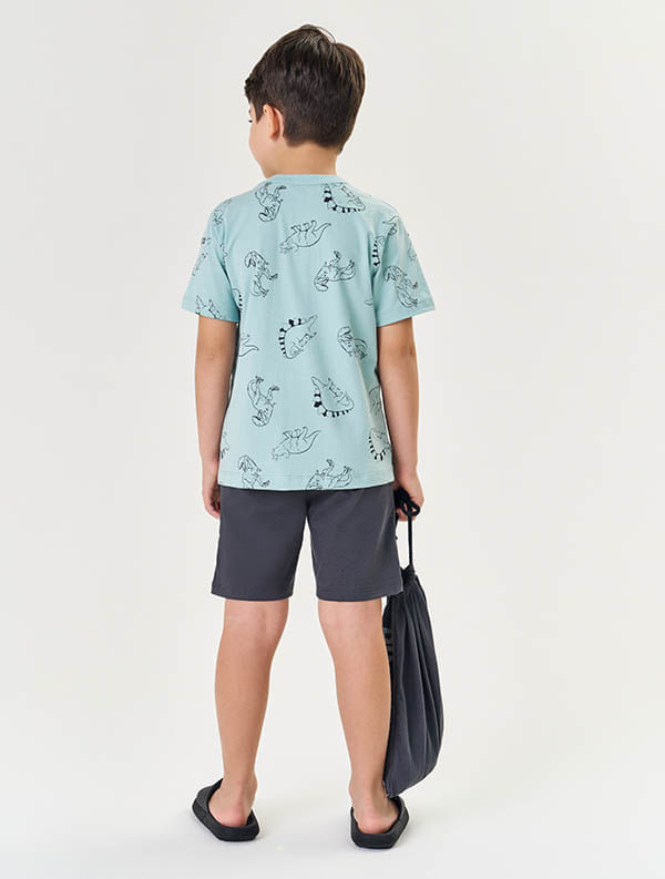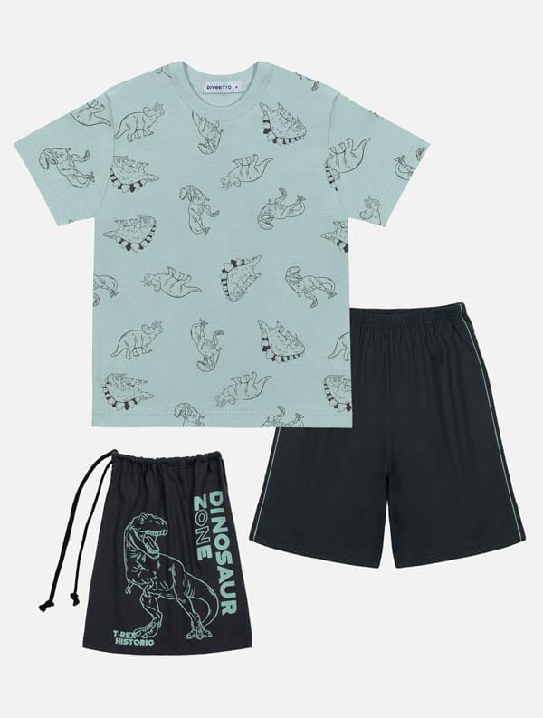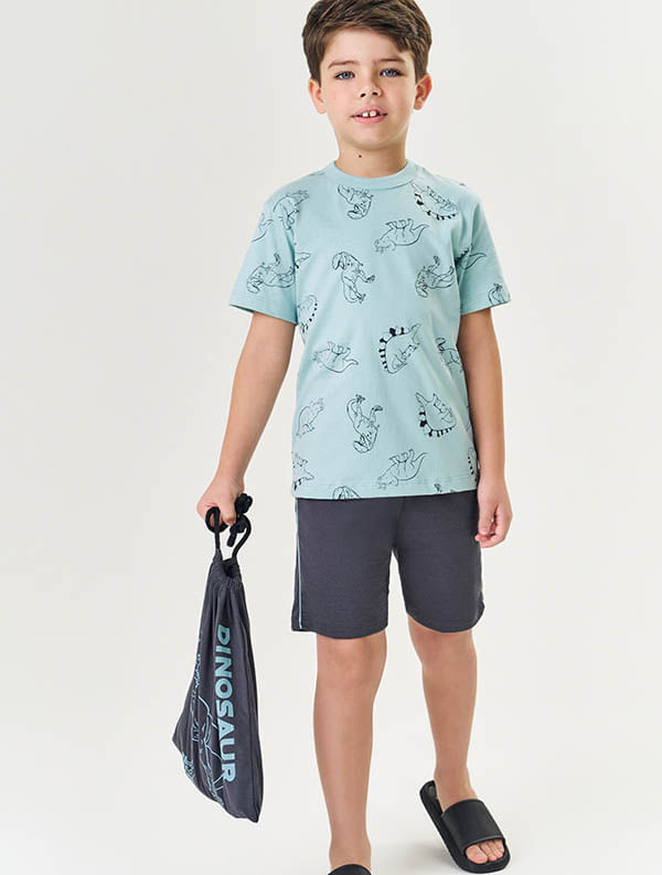 Este pijama é uma verdadeira aventura para os pequenos fãs de dinossauros! A camiseta, feita em meia malha, apresenta uma estampa total de dinossauro, trazendo diversão e estilo para as horas de descanso. A bermuda, também em meia malha, possui elástico no cós para um ajuste confortável e filetes contrastantes nas laterais, adicionando um toque moderno ao visual. Além disso, o conjunto acompanha uma bolsa super prática com estampa de dinossauro frontal e fechamento em cadarço, perfeita para levar o pijama em passeios ou dormir na casa de amigos. Combinando conforto, estilo e funcionalidade, esse pijama é ideal para noites de aventuras e diversão! Alto Verão 2024/2025. O modelo veste tamanho 06 e possui 1,18cm de altura.