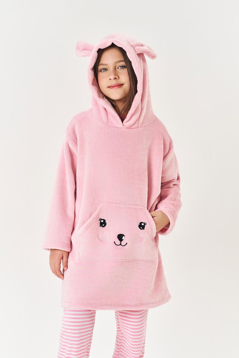 Aqueça e encante sua pequena com nosso adorável poncho infantil! Confeccionado em Fleece: Este poncho é feito em fleece, proporcionando um toque incrivelmente macio e aconchegante para as noites frias de inverno. Detalhes Encantadores: Com orelhas 3D no capuz, este poncho transforma a sua menina em uma verdadeira coelhinha! O bordado de rostinho de coelho no bolso canguru adiciona ainda mais charme e diversão à peça. Comprimento Midi: O comprimento midi torna este poncho perfeito para combinar com os pijamas da coleção de inverno, mantendo sua filha aquecida e estilosa. A escolha perfeita para garantir que sua menina esteja sempre confortável e encantadora. Ideal para as noites frias, ele complementa qualquer pijama com um toque lúdico e caloroso! Coleção Inverno 2025. A modelo veste tamanho 06 e possui 1,22cm de altura.