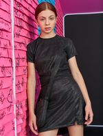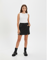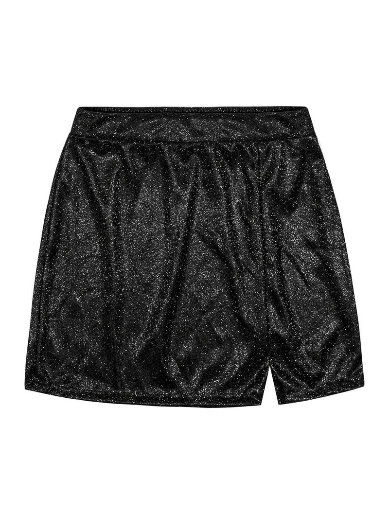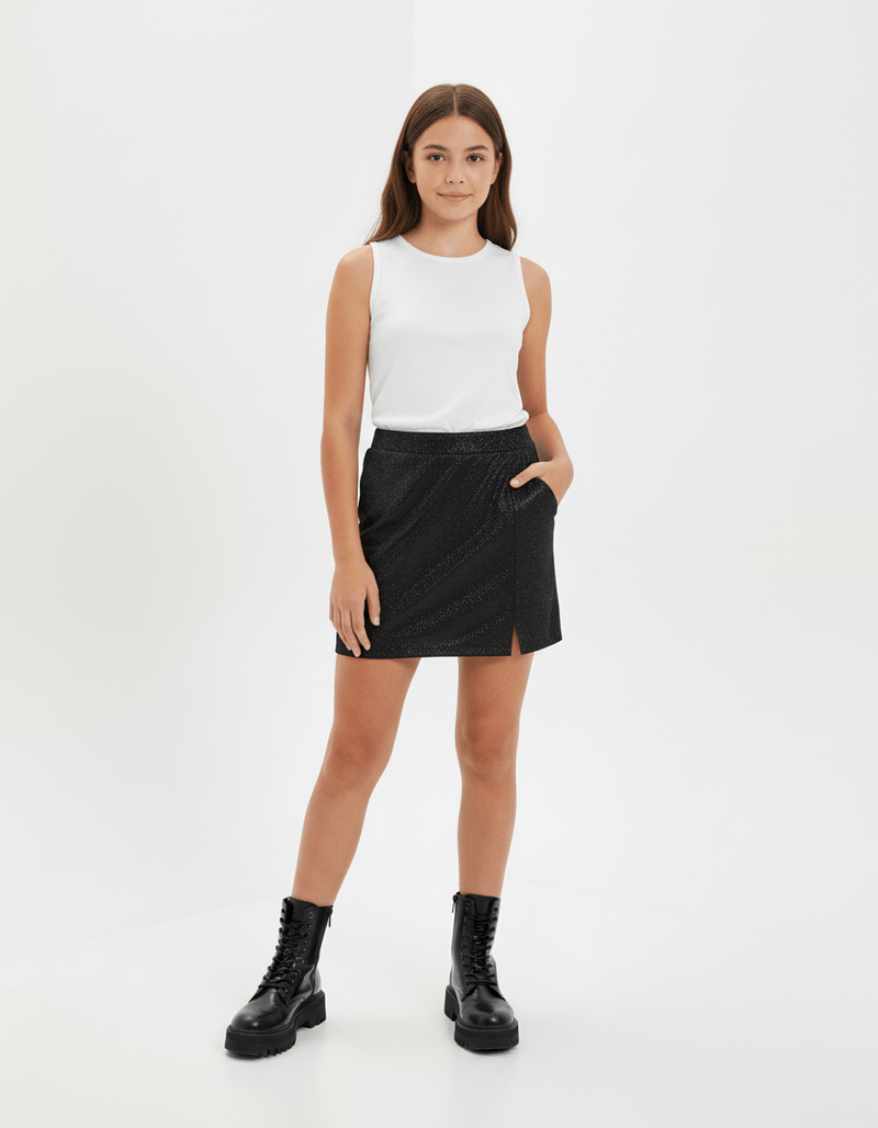 Saia juvenil feminino em malha glow com elástico costas no cós e recorte frontal com abertura. Inverno 2024. Modelo veste tamanho 18 e possui 1,62 de altura.