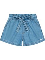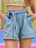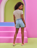 Short em jeans charm é uma peça super versátil para o seu guarda-roupa! Com elástico e faixa para laço no cós, proporciona um ajuste confortável e um toque de estilo adicional. Bolsos frontais e uma braguilha falsa completam o design prático e moderno. Uma plaquinha decorativa próxima da bainha adiciona um detalhe sofisticado ao visual. Ideal para criar looks descontraídos e cheios de personalidade para diversas ocasiões. Primavera 24. A modelo veste tamanho 14 e possui 1,62 cm de altura.