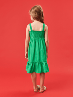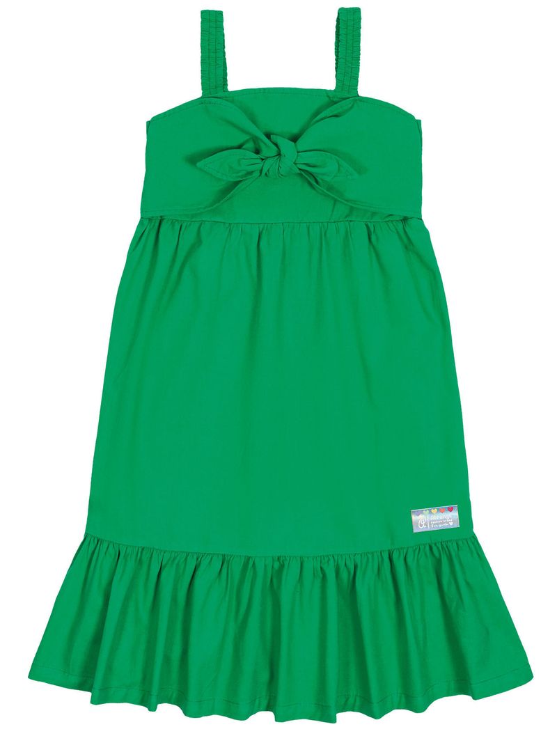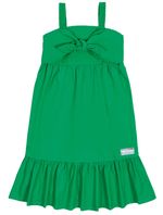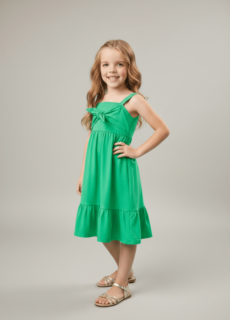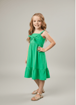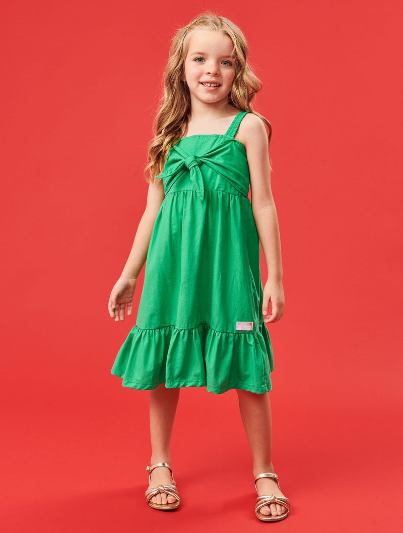 Vestido feminino em tricoline com recorte formando um laço frontal, detalhe em lastex nas costas e etiqueta decorativa próximo a barra de babado. Alto Verão 24. Modelo veste tamanho 4 e possui 1,15 de altura.
