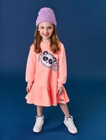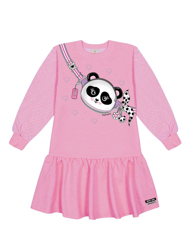 Vestido feminino em moletom com detalhe de tule nas mangas estampa com strass frontal abertura com botão nas costas para melhor vestir e etiqueta decorativa no recorte próximo da bainha. Inverno 2024. Modelo veste tamanho 4 e possui 1 12 de altura.