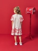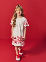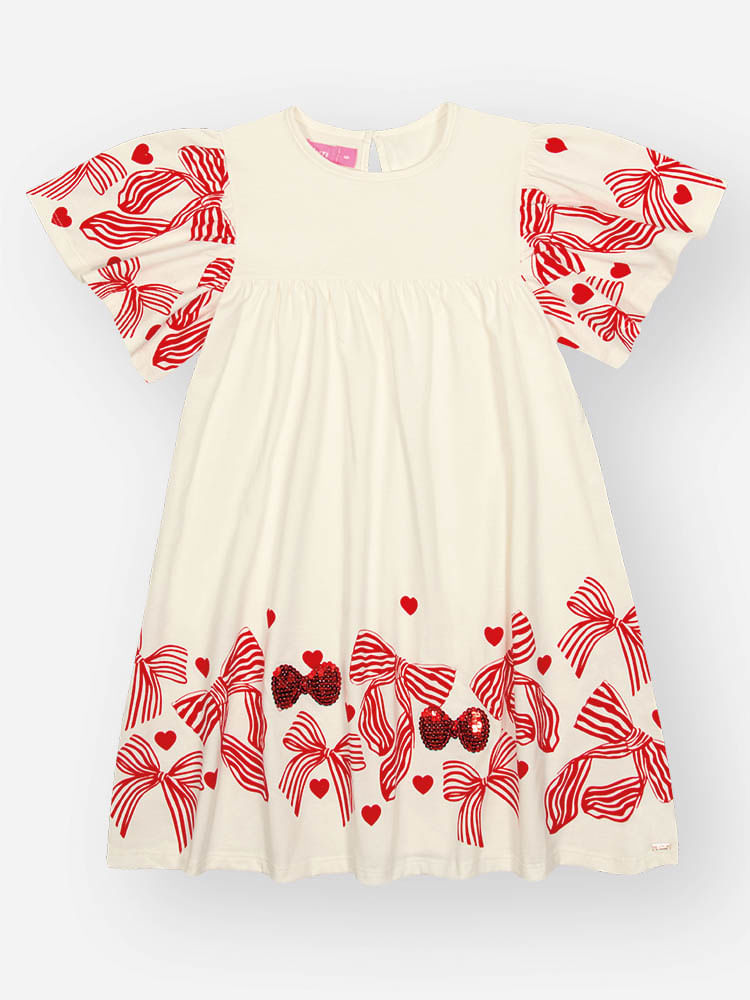 Com modelagem rodada e mangas franzidas, o vestido traz um visual encantador que combina feminilidade e diversão. A estampa exclusiva de laços e corações, aplicada na barra e nas mangas, ganha ainda mais destaque com o brilho especial dos bordados em paetê, deixando a peça única e especial.