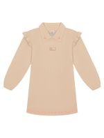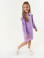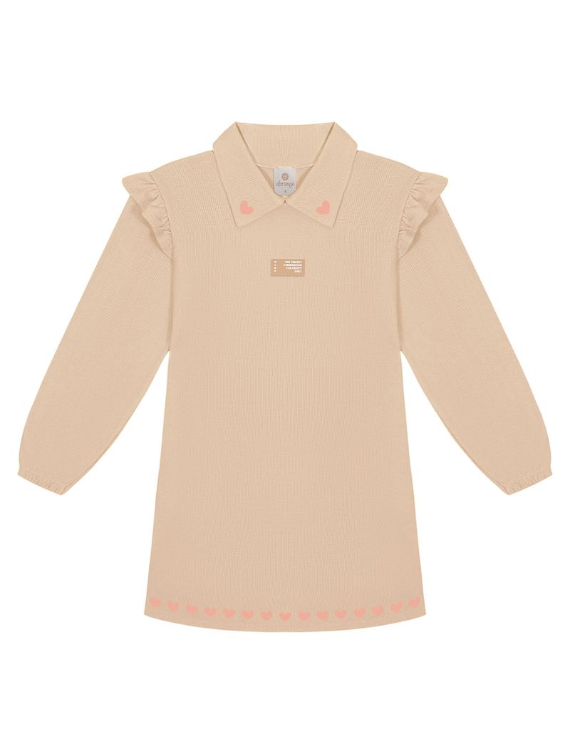 Vestido feminino em moletinho waffle com estampa na gola e próximo da bainha etiqueta decorativa no peito detalhe de babado nos ombros e elástico nos punhos. Inverno 2024. Modelo veste tamanho 8 e possui 1 35 de altura.