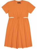 Vestido em malha anarruga combina conforto e modernidade, trazendo uma abertura na cintura com elástico, detalhe de argola de metal no centro e uma charmosa plaquinha decorativa metalizada. Perfeito para quem busca um visual sofisticado e contemporâneo, ideal para diversas ocasiões com um toque de estilo único. Primavera 24. A modelo veste tamanho 14 e possui 1,59 cm de altura.