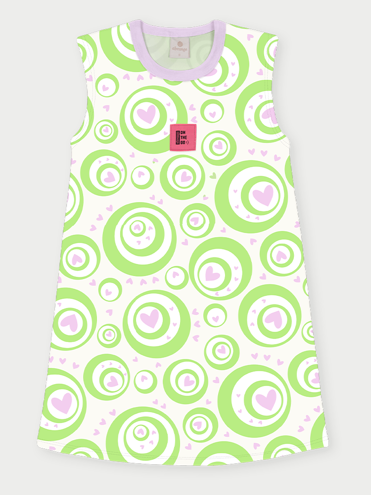 Com modelagem soltinha e leve, o vestido é prático e versátil para momentos casuais, passeios em família e até ocasiões mais especiais no verão. O design divertido conta com estampa rotativa de círculos coloridos com corações, que traz um ar moderno e cheio de energia para o visual.
