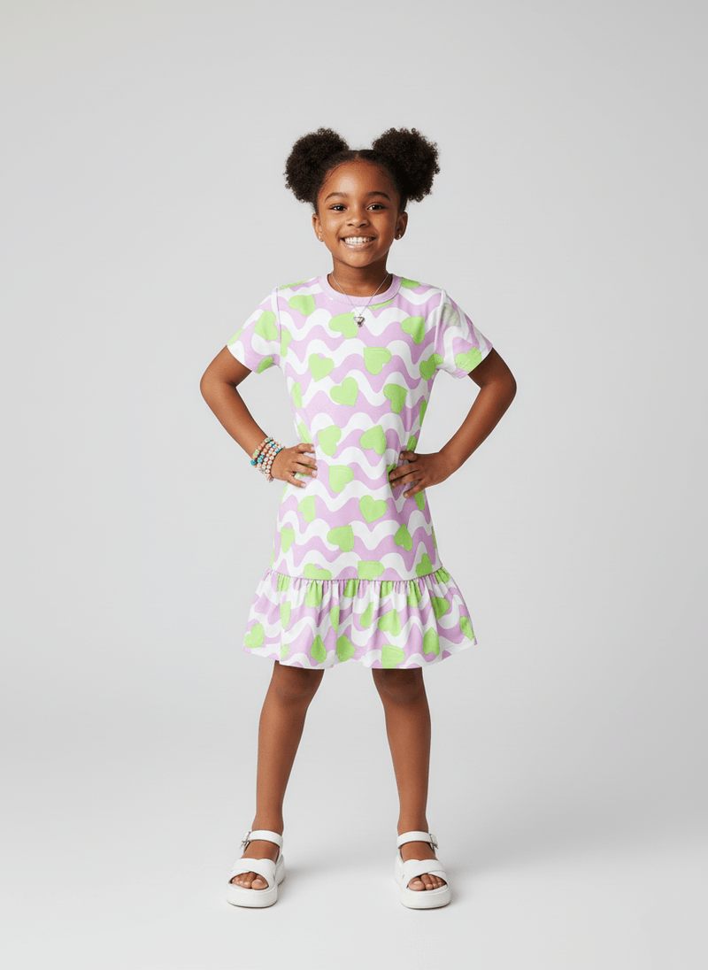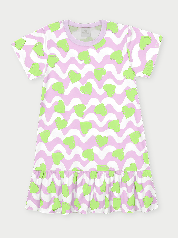 Com modelagem charmosa e detalhe franzido na barra, o vestido traz um visual moderno e descontraído, ideal para passeios, festas de aniversário, encontros em família ou até para o dia a dia escolar. As estampas são exclusivas e super divertidas, com corações coloridos em diferentes composições, que deixam o look alegre, delicado e cheio de personalidade.