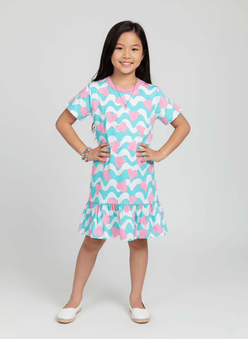 Com modelagem charmosa e detalhe franzido na barra, o vestido traz um visual moderno e descontraído, ideal para passeios, festas de aniversário, encontros em família ou até para o dia a dia escolar. As estampas são exclusivas e super divertidas, com corações coloridos em diferentes composições, que deixam o look alegre, delicado e cheio de personalidade.