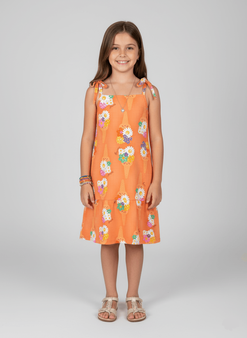 Com modelagem leve e franzido na barra, o vestido traz caimento soltinho e moderno. As alcinhas finas ajustáveis com laço adicionam um detalhe delicado e funcional, tornando a peça prática e cheia de estilo. As estampas coloridas de sorvetes decorados com flores dão um ar lúdico e alegre, perfeito para looks descontraídos no verão, passeios ao ar livre, festas ou até momentos em família.