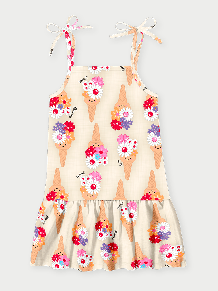 Com modelagem leve e franzido na barra, o vestido traz caimento soltinho e moderno. As alcinhas finas ajustáveis com laço adicionam um detalhe delicado e funcional, tornando a peça prática e cheia de estilo. As estampas coloridas de sorvetes decorados com flores dão um ar lúdico e alegre, perfeito para looks descontraídos no verão, passeios ao ar livre, festas ou até momentos em família.