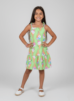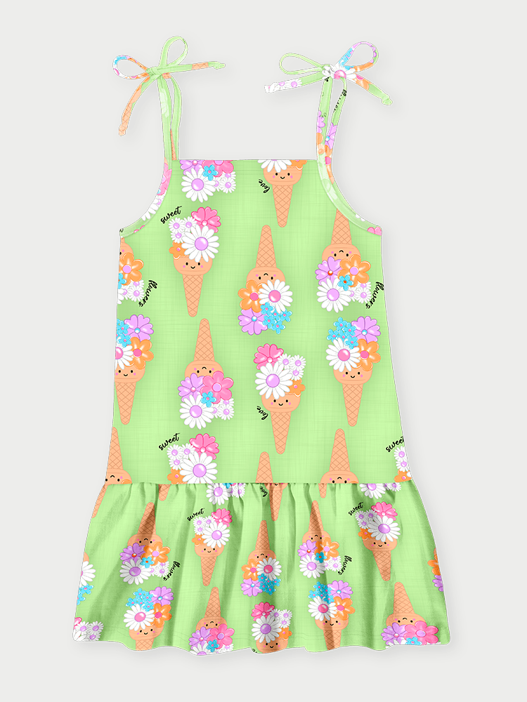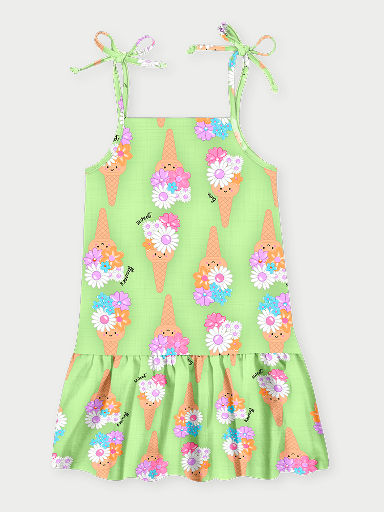 Com modelagem leve e franzido na barra, o vestido traz caimento soltinho e moderno. As alcinhas finas ajustáveis com laço adicionam um detalhe delicado e funcional, tornando a peça prática e cheia de estilo. As estampas coloridas de sorvetes decorados com flores dão um ar lúdico e alegre, perfeito para looks descontraídos no verão, passeios ao ar livre, festas ou até momentos em família.