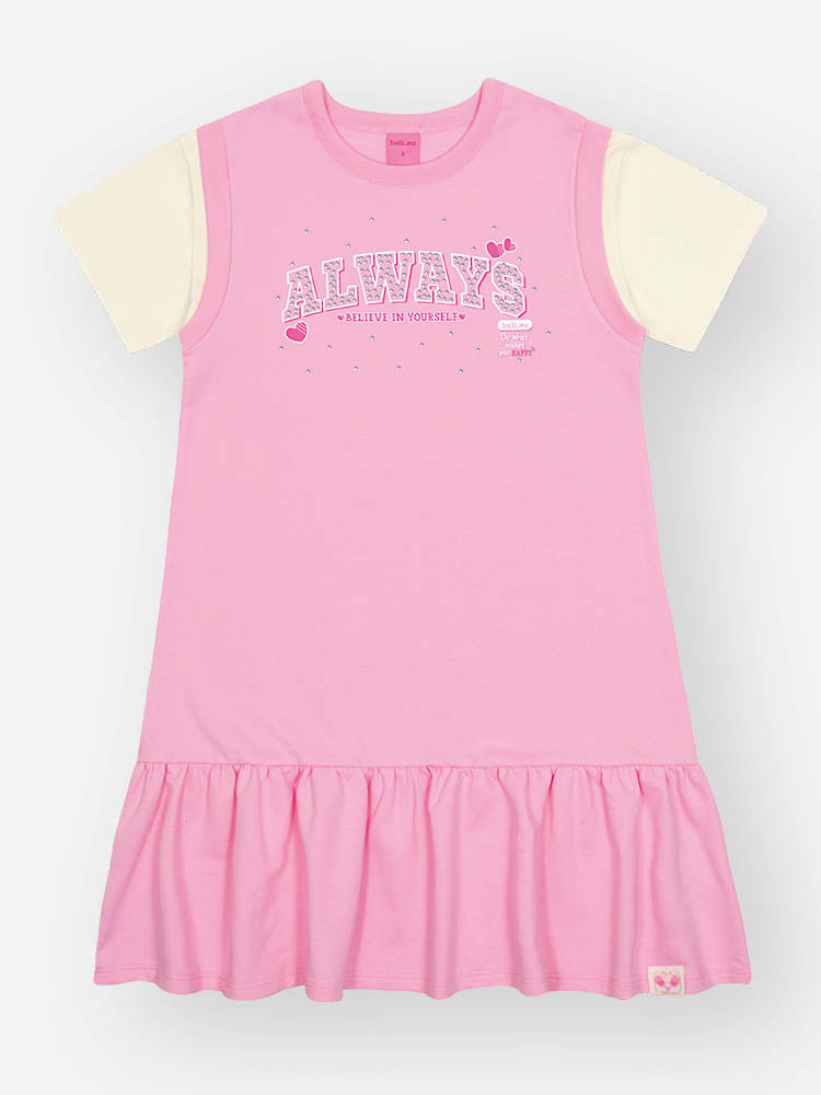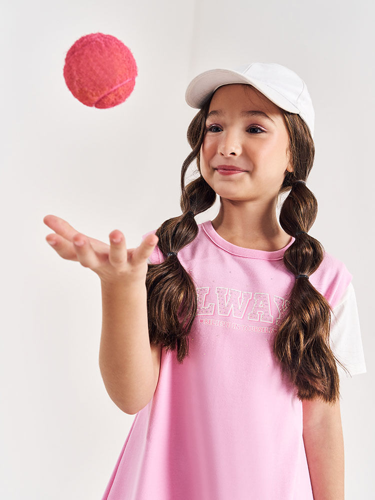 Com mangas em tom natural contrastante, o modelo traz um visual moderno e delicado. A estampa frontal com a frase “Always Believe in Yourself” (Acredite em você mesma), acompanhada de detalhes em strass, adiciona brilho e inspiração ao look. O recorte com franzido na barra completa o design, criando um efeito rodado super fofo.